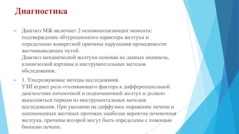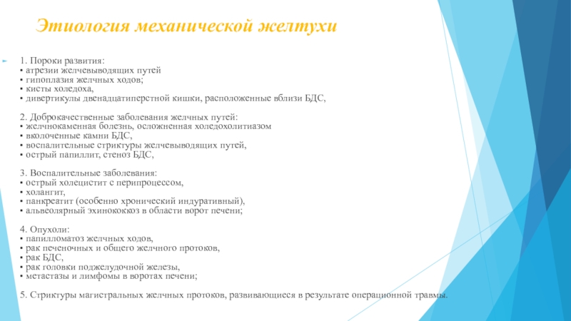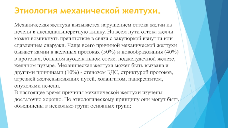 препятствие в связи с закупоркой изнутри или сдавлением снаружи. Чаще всего причиной механической желтухи бывают камни в желчных протоках (50%) и новообразования (40%) в протоках, большом дуоденальном соске, поджелудочной железе, желчном пузыре. Механическая желтуха может быть вызвана и другими причинами (10%) - стенозом БДС, стриктурой протоков, атрезией желчевыводящих путей, холангитом, панкреатитом, опухолями печени.