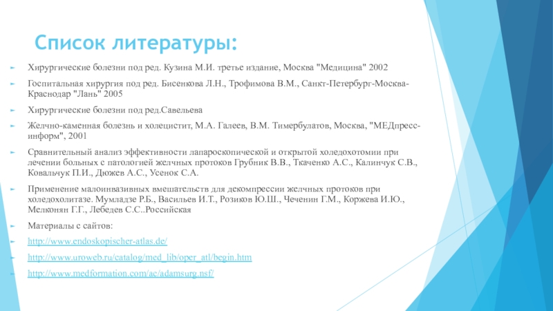 Применение малоинвазивных вмешательств для декомпрессии желчных протоков при холедохолитазе. Мумладзе Р.Б., Васильев И.Т., Розиков Ю.Ш., Чеченин Г.М., Коржева И.Ю., Мелконян Г.Г., Лебедев С.С..Российская