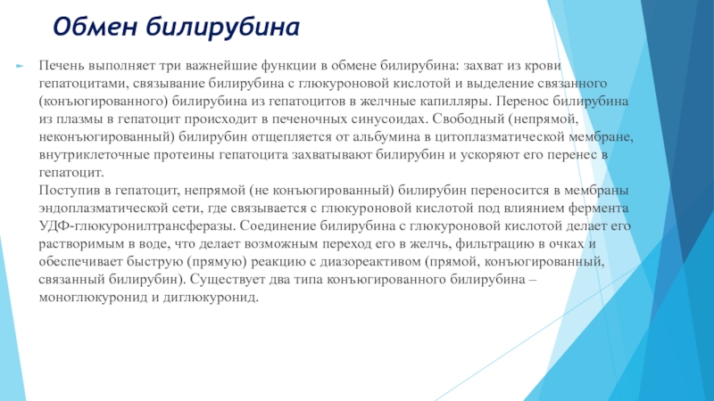 связанного (конъюгированного) билирубина из гепатоцитов в желчные капилляры. Перенос билирубина из плазмы в гепатоцит происходит в печеночных синусоидах. Свободный (непрямой, неконъюгированный) билирубин отщепляется от альбумина в цитоплазматической мембране, внутриклеточные протеины гепатоцита захватывают билирубин и ускоряют его перенес в гепатоцит.
