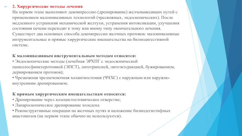 и стабилизации состояния больного, либо по жизненным показаниям на высоте желтухи (деструктивный холецистит, осложненный перфорацией и перитонитом, отказ от ЭРХПГ, ЧЧХС, психические заболевания, крупный камень, фиксированный в области шейки, но обтурироваший холедох), Выбор метода операции основывается на результатах дооперационной диагностики и данных интраоперационной ревизии протоков с учетом общего состояния больного. Обычно применяются разнообразные варианты холедохотомии и литоэкстракции при ЖКБ, осложненной холедохолитиазом, а также резекции с наложением билиодигестивных анастомозов и опухолях панкреатобилиарной зоны.