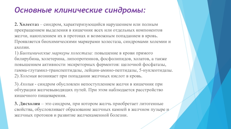 в протоках и возможным попаданием в кровь. Проявляется биохимическими маркерами холестаза, синдромами холемии и ахолии.