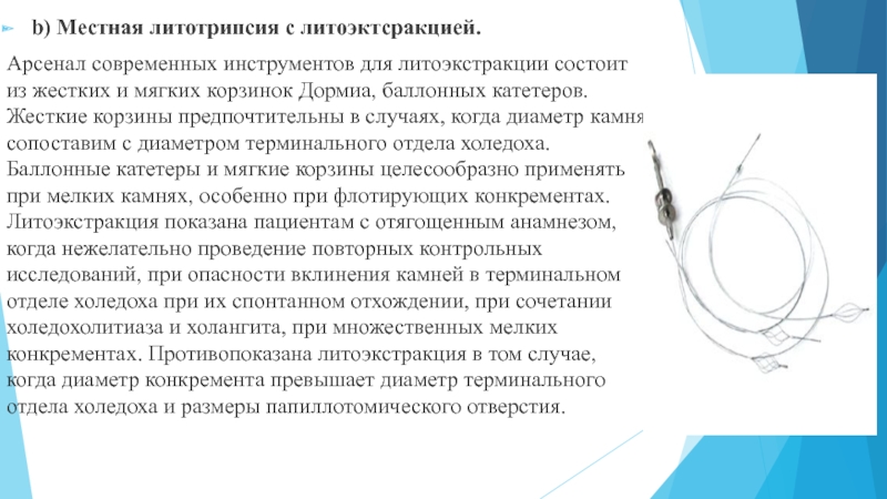 предпочтительны в случаях, когда диаметр камня сопоставим с диаметром терминального отдела холедоха. Баллонные катетеры и мягкие корзины целесообразно применять при мелких камнях, особенно при флотирующих конкрементах. Литоэкстракция показана пациентам с отягощенным анамнезом, когда нежелательно проведение повторных контрольных исследований, при опасности вклинения камней в терминальном отделе холедоха при их спонтанном отхождении, при сочетании холедохолитиаза и холангита, при множественных мелких конкрементах. Противопоказана литоэкстракция в том случае, когда диаметр конкремента превышает диаметр терминального отдела холедоха и размеры папиллотомического отверстия.