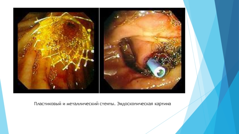 Слайд 53Пластиковый и металлический стенты. Эндоскопическая картина