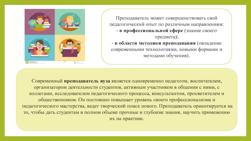 Преподаватель может совершенствовать свой педагогический опыт по различным направлениям: