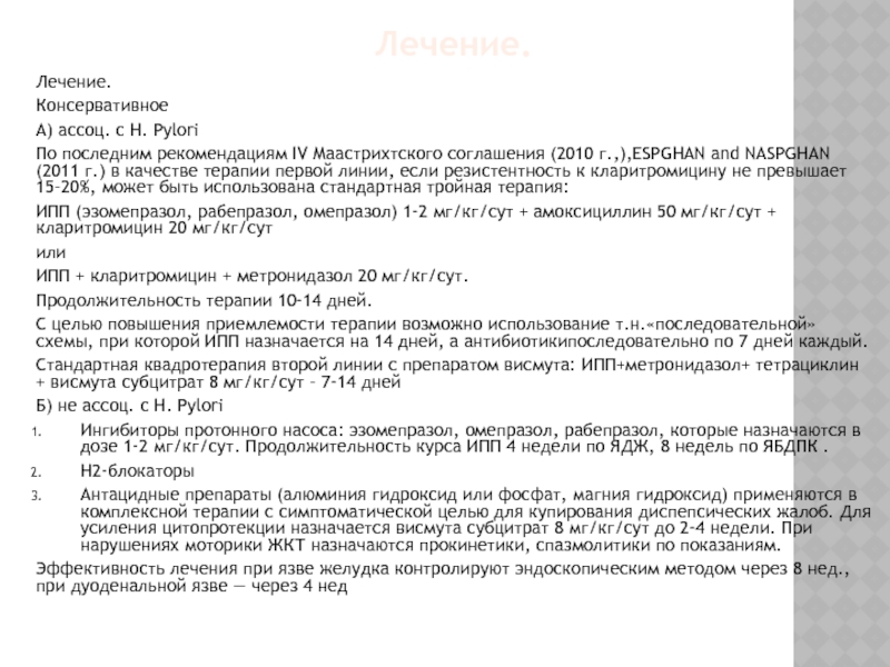 Ингибиторы протонного насоса: эзомепразол, омепразол, рабепразол, которые назначаются в дозе 1-2 мг/кг/сут. Продолжительность курса ИПП 4 недели по ЯДЖ, 8 недель по ЯБДПК .