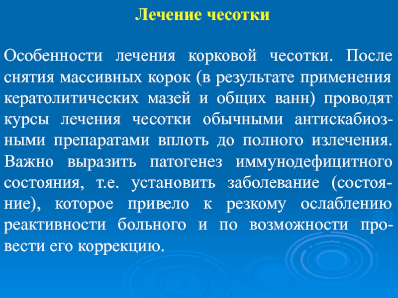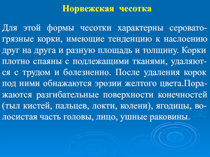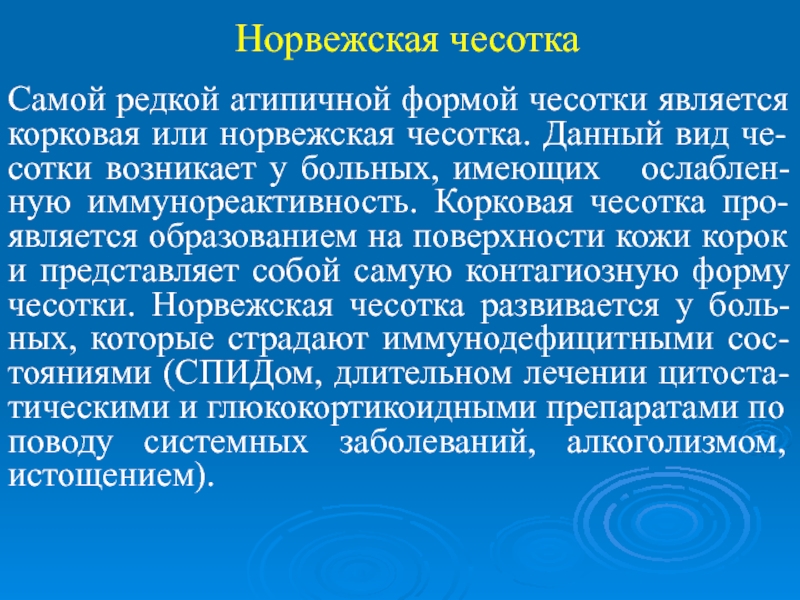 чесотка. Данный вид че-сотки возникает у больных, имеющих ослаблен-ную