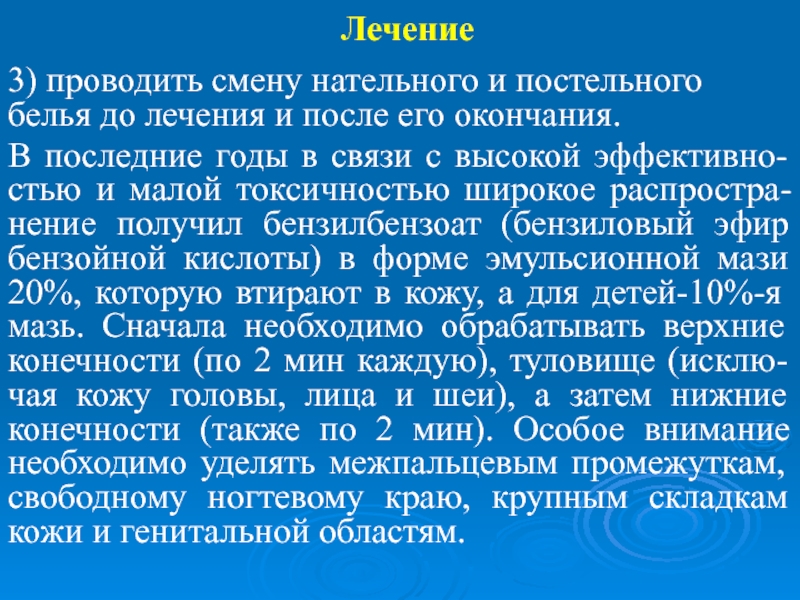 белье; грязное белье необходимо после стирки подвергать термообработке. Повторное обрабаты-вание кожи проводят на 2-4 день. Данная методика обработки обусловлена тем, что вылупившиеся в течение 2-х суток личинки чесоточного зудня более доступны воздействию противочесоточной терапии. Через 3 дня после окончания лечения больному рекомендуют повторную смену натель-ного и постельного белья, а также тщательное мытье.