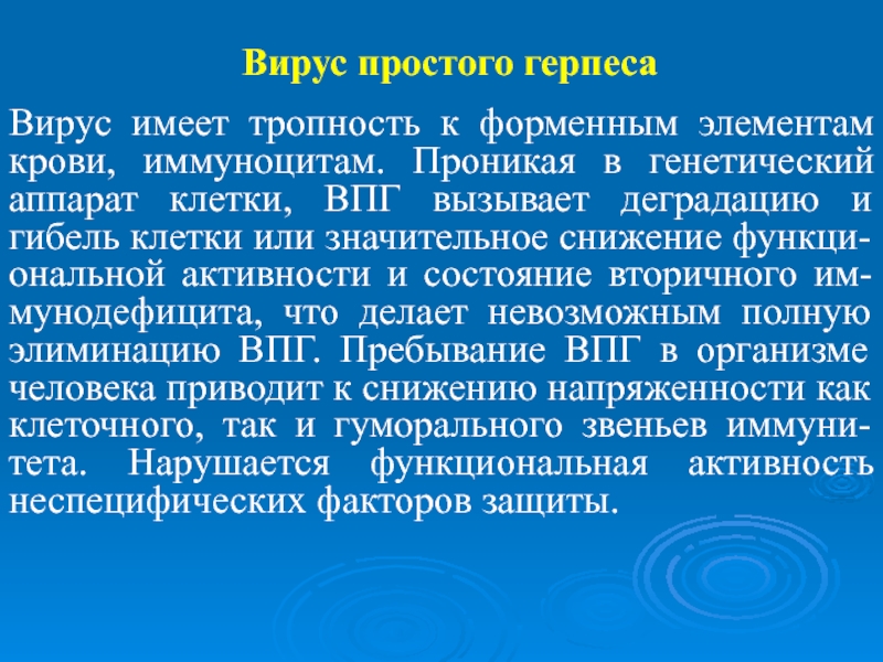клетки или значительное снижение функци-ональной активности и состояние вторичного им-мунодефицита, что делает невозможным полную элиминацию ВПГ. Пребывание ВПГ в организме человека приводит к снижению напряженности как клеточного, так и гуморального звеньев иммуни-тета. Нарушается функциональная активность неспецифических факторов защиты.