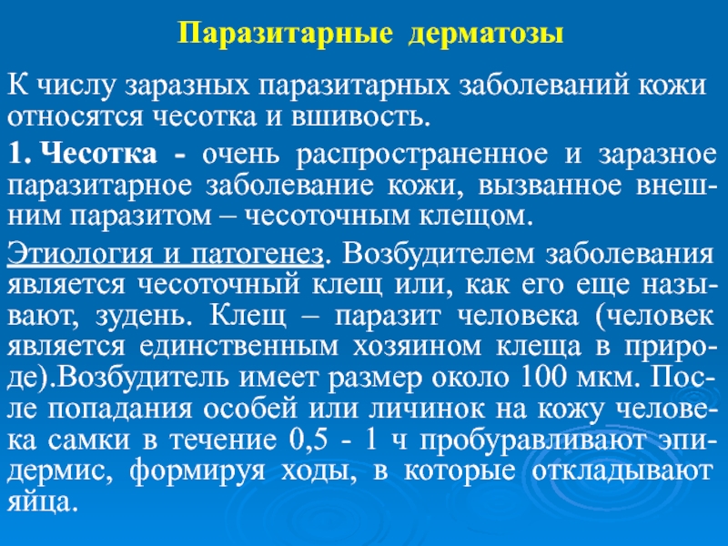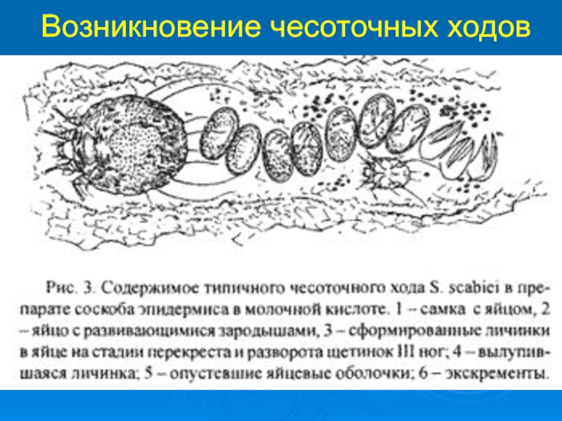 Этиология и патогенез. Возбудителем заболевания является чесоточный клещ или, как его еще назы-вают, зудень. Клещ – паразит человека (человек является единственным хозяином клеща в приро-де).Возбудитель имеет размер около 100 мкм. Пос-ле попадания особей или личинок на кожу челове-ка самки в течение 0,5 - 1 ч пробуравливают эпи-дермис, формируя ходы, в которые откладывают яйца.
