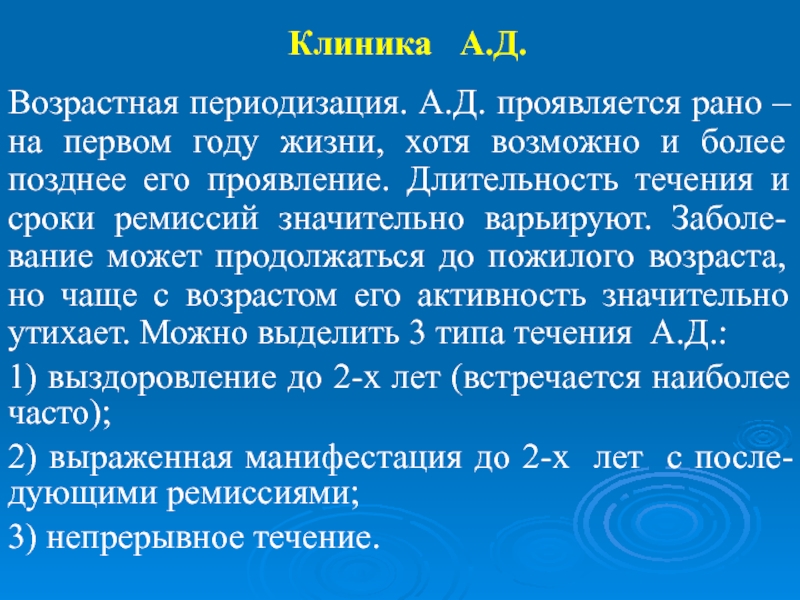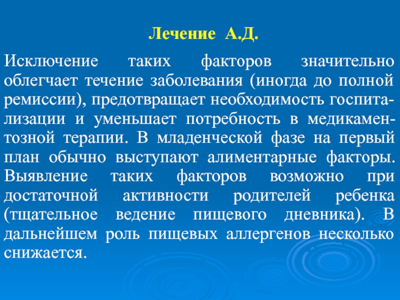 общее и наружное лечение, климатотерапию. Перед началом терапии необходимо провести клинико-лабораторное обследование, выявить факторы, провоцирующие обострение заболева-ния.Для успешного лечения А.Д. очень важны обнаружение и контроль факторов риска, вызыва-ющих обострение заболевания (психогенных, метеорологических, инфекционных и иных факторов).