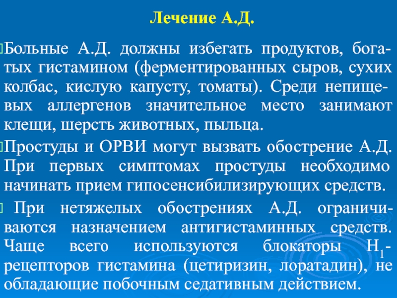 Больные А.Д. должны избегать продуктов, бога-тых гистамином (ферментированных сыров,