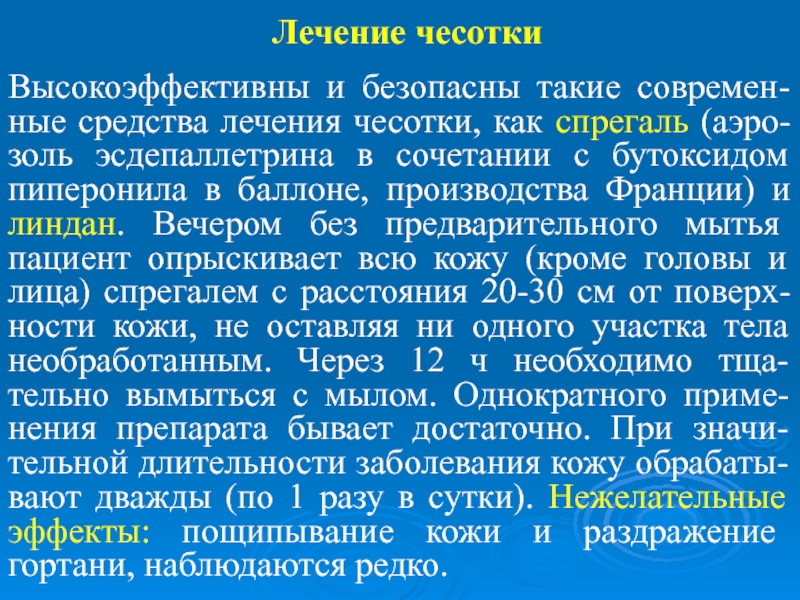 производства Франции) и линдан. Вечером без предварительного мытья пациент опрыскивает всю кожу (кроме головы и лица) спрегалем с расстояния 20-30 см от поверх-ности кожи, не оставляя ни одного участка тела необработанным. Через 12 ч необходимо тща-тельно вымыться с мылом. Однократного приме-нения препарата бывает достаточно. При значи-тельной длительности заболевания кожу обрабаты-вают дважды (по 1 разу в сутки). Нежелательные эффекты: пощипывание кожи и раздражение гортани, наблюдаются редко.