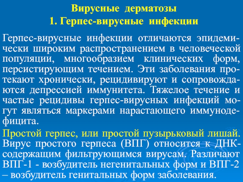 Простой герпес, или простой пузырьковый лишай. Вирус простого герпеса (ВПГ) относится к ДНК-содержащим фильтрующимся вирусам. Различают ВПГ-1 - возбудитель негенитальных форм и ВПГ-2 – возбудитель генитальных форм заболевания.
