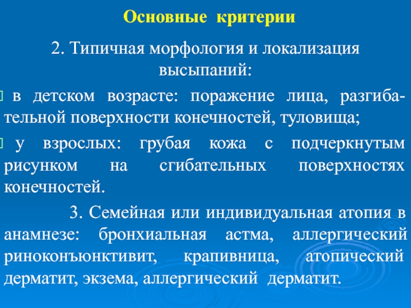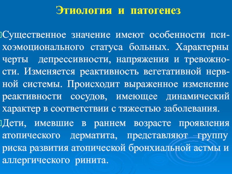 жалуются на кожный зуд. Экземоподобные реакции наблю-даются в периоды обострения А.Д.. Характерны выраженная сухость кожи, резко усиленный пило-моторный рефлекс. Среди дерматологических осложнений А.Д. 1-е место занимает присое-динение вторичной бактериальной инфекции. В тех случаях, когда преобладает стафилококковая инфекция, говорят о пустулизации. Если ослож-нение А.Д. обусловлено стрептококками, разви-вается импетигинизация.