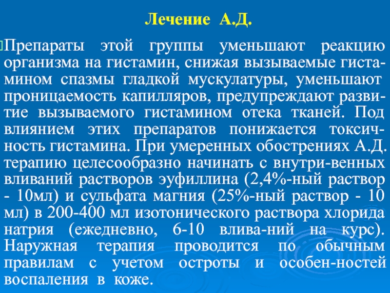 вызываемого гистамином отека тканей. Под влиянием этих препаратов понижается токсич-ность гистамина. При умеренных обострениях А.Д. терапию целесообразно начинать с внутри-венных вливаний растворов эуфиллина (2,4%-ный раствор - 10мл) и сульфата магния (25%-ный раствор - 10 мл) в 200-400 мл изотонического раствора хлорида натрия (ежедневно, 6-10 влива-ний на курс). Наружная терапия проводится по обычным правилам с учетом остроты и особен-ностей воспаления в коже.