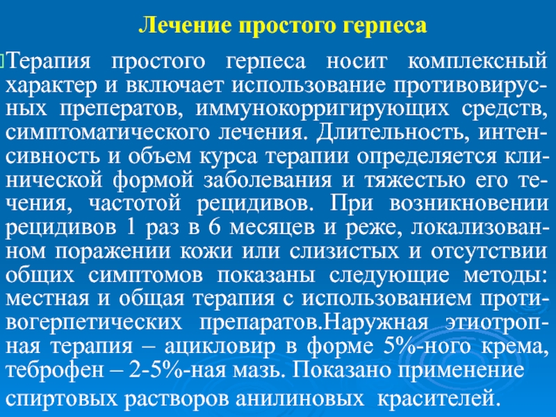 объем курса терапии определяется кли-нической формой заболевания и тяжестью его те-чения, частотой рецидивов. При возникновении рецидивов 1 раз в 6 месяцев и реже, локализован-ном поражении кожи или слизистых и отсутствии общих симптомов показаны следующие методы: местная и общая терапия с использованием проти-вогерпетических препаратов.Наружная этиотроп-ная терапия – ацикловир в форме 5%-ного крема, теброфен – 2-5%-ная мазь. Показано применение