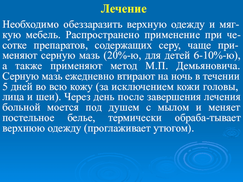детей 6-10%-ю), а также применяют метод М.П. Демьяновича. Серную мазь ежедневно втирают на ночь в течении 5 дней во всю кожу (за исключением кожи головы, лица и шеи). Через день после завершения лечения больной моется под душем с мылом и меняет постельное белье, термически обраба-тывает верхнюю одежду (проглаживает утюгом).