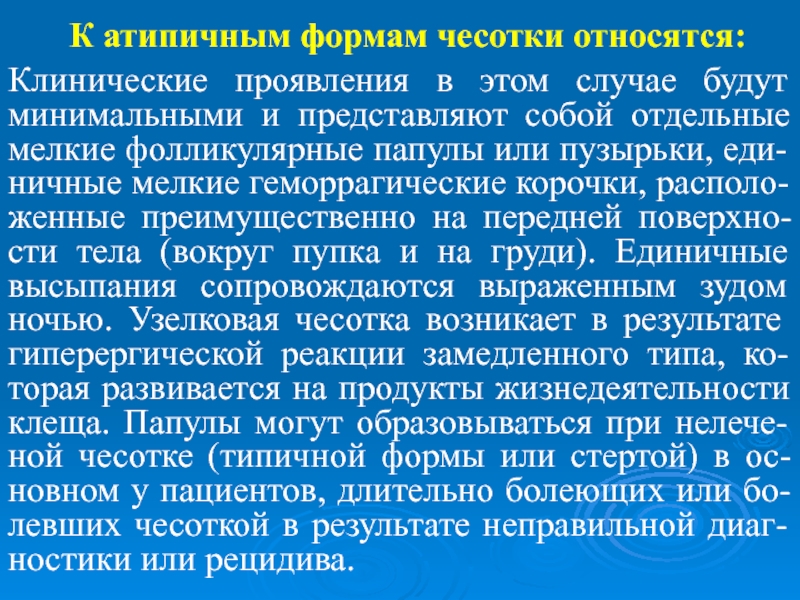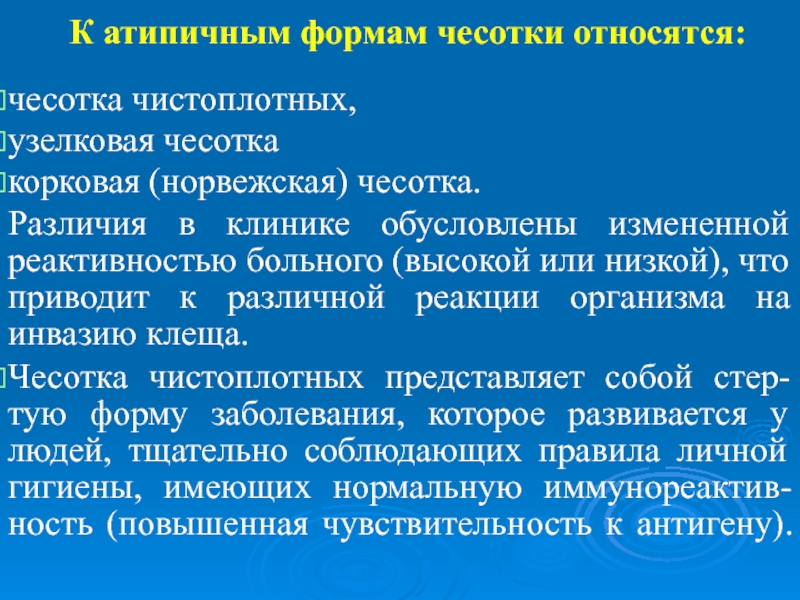 Чесотка чистоплотных представляет собой стер-тую форму заболевания, которое развивается у людей, тщательно соблюдающих правила личной гигиены, имеющих нормальную иммунореактив-ность (повышенная чувствительность к антигену).