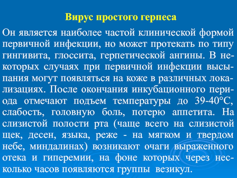 не-которых случаях при первичной инфекции высы-пания могут появляться на коже в различных лока-лизациях. После окончания инкубационного пери-ода отмечают подъем температуры до 39-40°C, слабость, головную боль, потерю аппетита. На слизистой полости рта (чаще всего на слизистой щек, десен, языка, реже - на мягком и твердом небе, миндалинах) возникают очаги выраженного отека и гиперемии, на фоне которых через нес-колько часов появляются группы везикул.