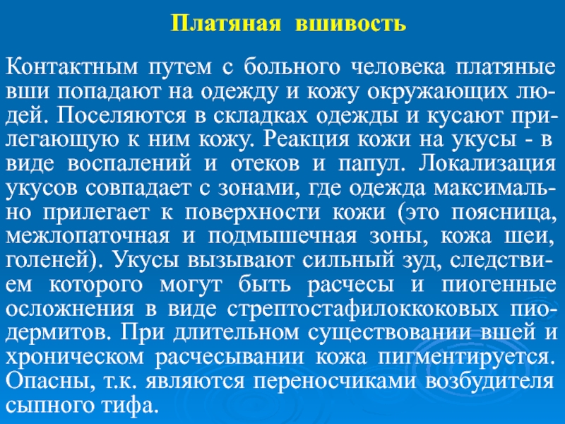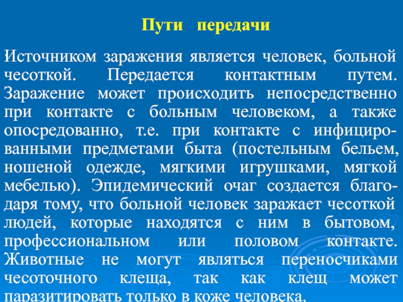 больным человеком, а также опосредованно, т.е. при контакте с инфициро-ванными предметами быта (постельным бельем, ношеной одежде, мягкими игрушками, мягкой мебелью). Эпидемический очаг создается благо-даря тому, что больной человек заражает чесоткой людей, которые находятся с ним в бытовом, профессиональном или половом контакте. Животные не могут являться переносчиками чесоточного клеща, так как клещ может паразитировать только в коже человека.