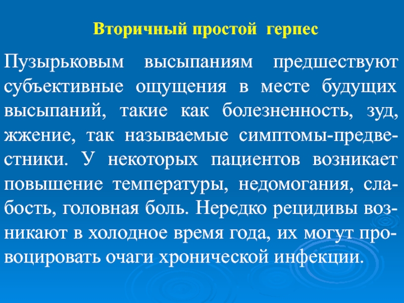 Слайд 73Вторичный или рецидивирующий, простой герпес