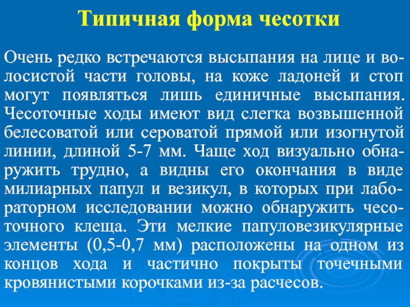 и стоп могут появляться лишь единичные высыпания. Чесоточные ходы имеют вид слегка возвышенной белесоватой или сероватой прямой или изогнутой линии, длиной 5-7 мм. Чаще ход визуально обна-ружить трудно, а видны его окончания в виде милиарных папул и везикул, в которых при лабо-раторном исследовании можно обнаружить чесо-точного клеща. Эти мелкие папуловезикулярные элементы (0,5-0,7 мм) расположены на одном из концов хода и частично покрыты точечными кровянистыми корочками из-за расчесов.
