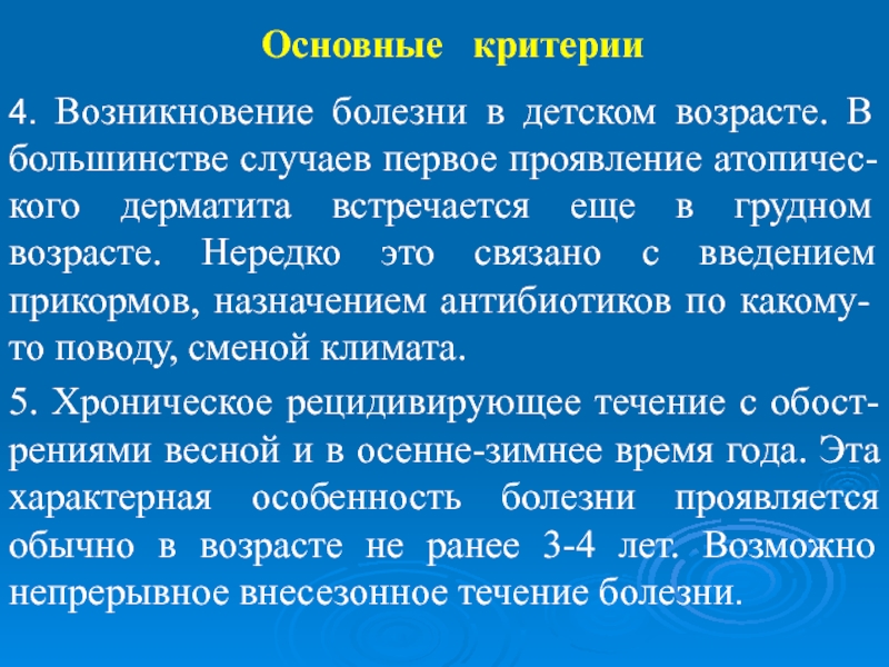 от сезона года течение (обострение заболева-ния весной и осенью). За периодами тяжелых реци-дивов могут следовать продолжительные ремиссии, во время которых дети чувствуют себя практически здоровыми. Экссудативные явления уменьшаются, с преобладанием папул. Экземо-подобные проявления имеют тенденцию к груп-пировке, наиболее часто проявляясь на пред-плечьях и голенях, напоминая бляшечную экзему или экзематид.