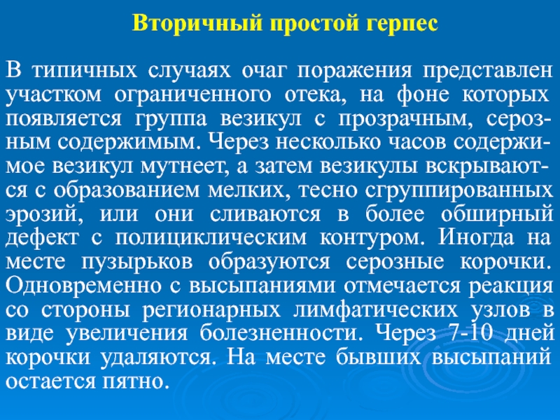 содержимым. Через несколько часов содержи-мое везикул мутнеет, а затем везикулы вскрывают-ся с образованием мелких, тесно сгруппированных эрозий, или они сливаются в более обширный дефект с полициклическим контуром. Иногда на месте пузырьков образуются серозные корочки. Одновременно с высыпаниями отмечается реакция со стороны регионарных лимфатических узлов в виде увеличения болезненности. Через 7-10 дней корочки удаляются. На месте бывших высыпаний остается пятно.