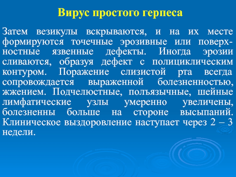 дефект с полициклическим контуром. Поражение слизистой рта всегда сопровождается выраженной болезненностью, жжением. Подчелюстные, полъязычные, шейные лимфатические узлы умеренно увеличены, болезненны больше на стороне высыпаний. Клиническое выздоровление наступает через 2 – 3 недели.