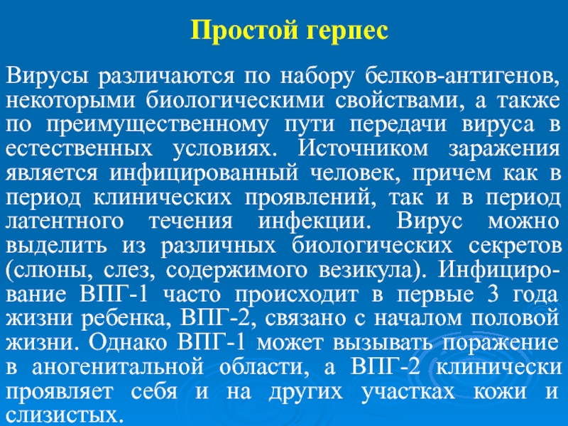 Источником заражения является инфицированный человек, причем как в период клинических проявлений, так и в период латентного течения инфекции. Вирус можно выделить из различных биологических секретов (слюны, слез, содержимого везикула). Инфициро-вание ВПГ-1 часто происходит в первые 3 года жизни ребенка, ВПГ-2, связано с началом половой жизни. Однако ВПГ-1 может вызывать поражение в аногенитальной области, а ВПГ-2 клинически проявляет себя и на других участках кожи и слизистых.