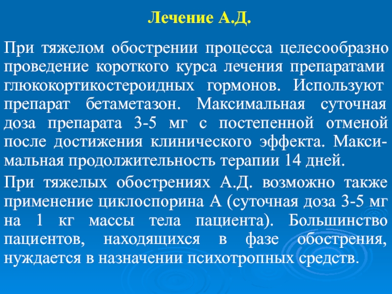 При тяжелых обострениях А.Д. возможно также применение циклоспорина А (суточная доза 3-5 мг на 1 кг массы тела пациента). Большинство пациентов, находящихся в фазе обострения, нуждается в назначении психотропных средств.