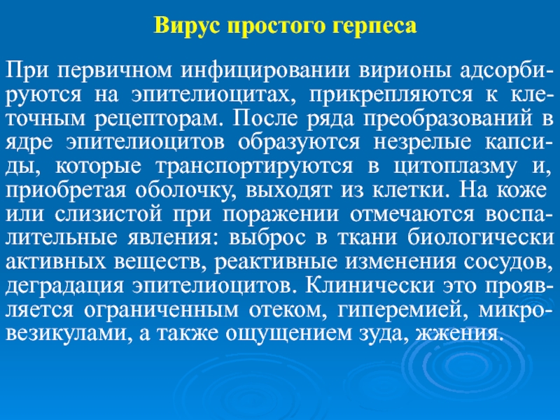 незрелые капси-ды, которые транспортируются в цитоплазму и, приобретая оболочку, выходят из клетки. На коже или слизистой при поражении отмечаются воспа-лительные явления: выброс в ткани биологически активных веществ, реактивные изменения сосудов, деградация эпителиоцитов. Клинически это прояв-ляется ограниченным отеком, гиперемией, микро-везикулами, а также ощущением зуда, жжения.