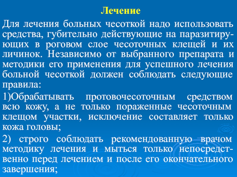 от выбранного препарата и методики его применения для успешного лечения больной чесоткой должен соблюдать следующие правила: