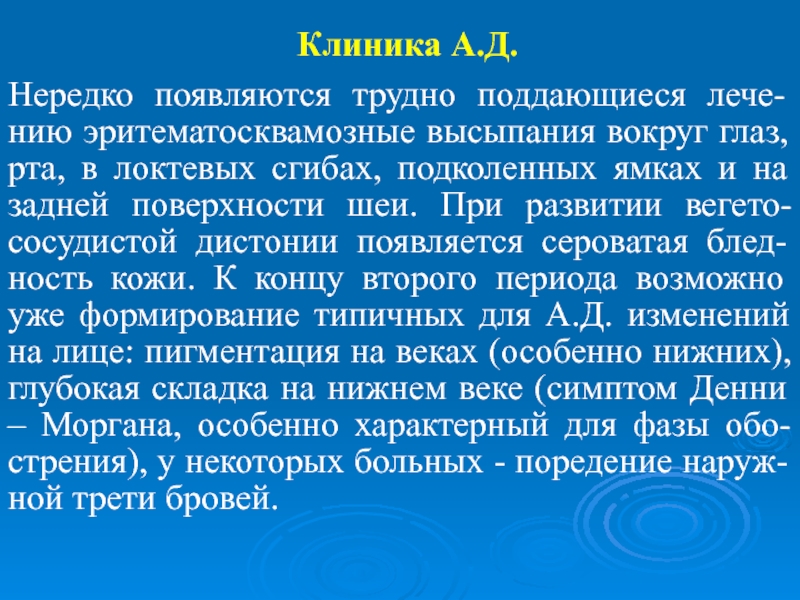 шеи. При развитии вегето-сосудистой дистонии появляется сероватая блед-ность кожи. К концу второго периода возможно уже формирование типичных для А.Д. изменений на лице: пигментация на веках (особенно нижних), глубокая складка на нижнем веке (симптом Денни – Моргана, особенно характерный для фазы обо-стрения), у некоторых больных - поредение наруж-ной трети бровей.