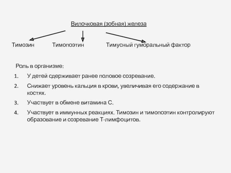Участвует в иммунных реакциях. Тимозин и тимопоэтин контролируют образование и созревание Т-лимфоцитов.