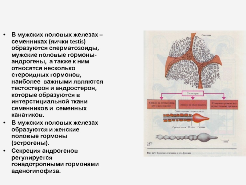 наиболее важными являются тестостерон и андростерон, которые образуются в интерстициальной ткани семенников и семенных канатиков.