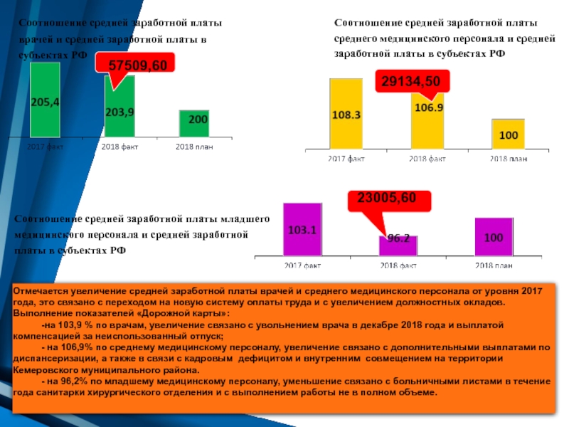 - на 106,9% по среднему медицинскому персоналу, увеличение связано с дополнительными выплатами по диспансеризации, а также в связи с кадровым дефицитом и внутренним совмещением на территории Кемеровского муниципального района.