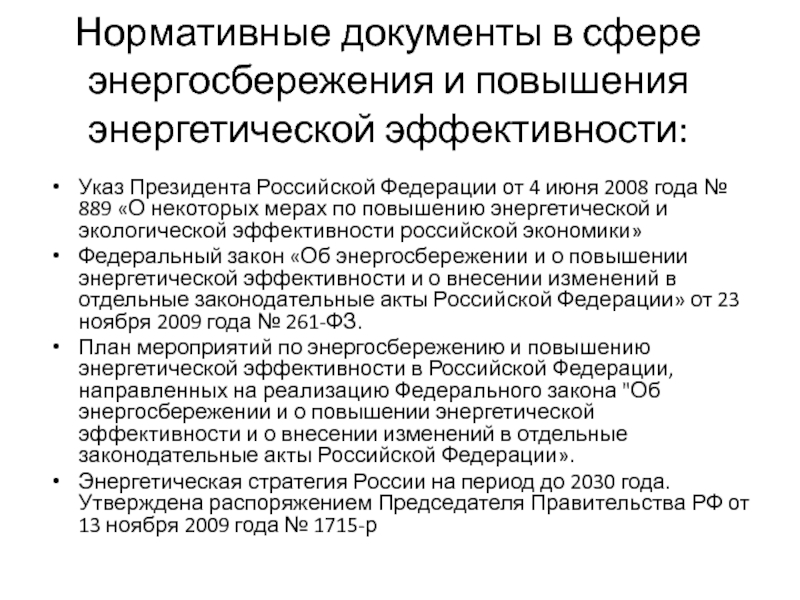 Слайд 8Нормативные документы в сфере энергосбережения и повышения энергетической эффективности: