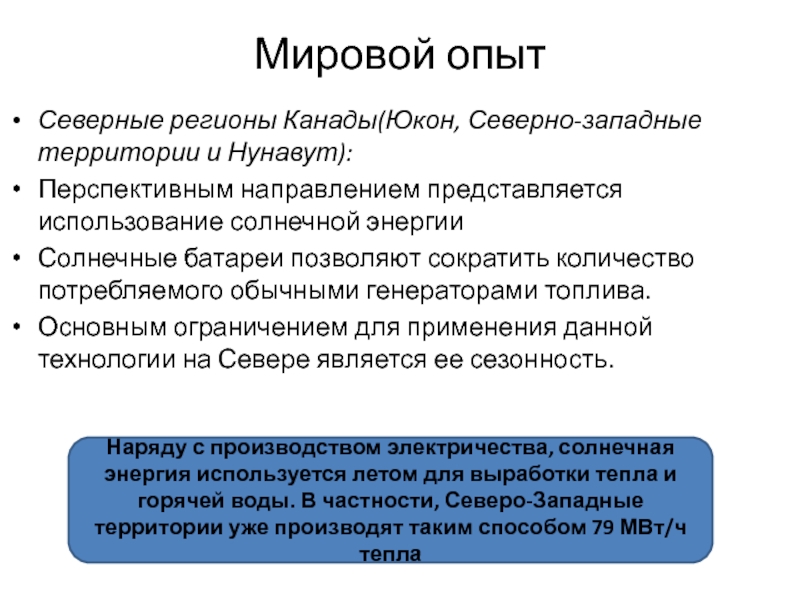 Наряду с производством электричества, солнечная энергия используется летом для выработки тепла и горячей воды. В частности, Северо-Западные территории уже производят таким способом 79 МВт/ч тепла