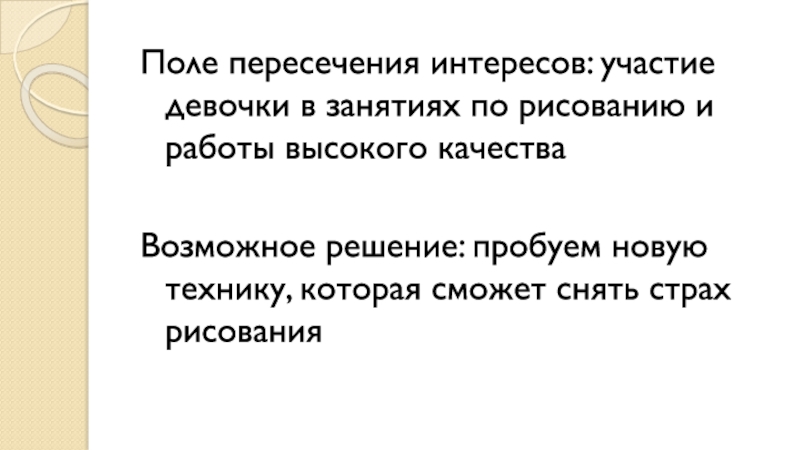 Поле пересечения интересов: участие девочки в занятиях по рисованию и работы высокого качества Возможное решение: пробуем новую