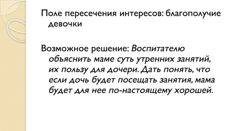 Поле пересечения интересов: благополучие девочки Возможное решение: Воспитателю объяснить маме суть утренних занятий, их пользу для дочери.