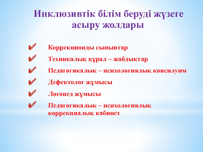 Инклюзивтік білім беруді жүзеге асыру жолдарыКоррекционды сыныптарТехникалық құрал – жабдықтарПедагогикалық – психологиялық консилуимДефектолог жұмысыЛогопед жұмысыПедагогикалық – психологиялық