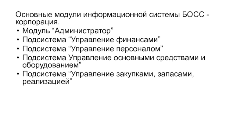 Слайд 12Основные модули информационной системы БОСС - корпорация.