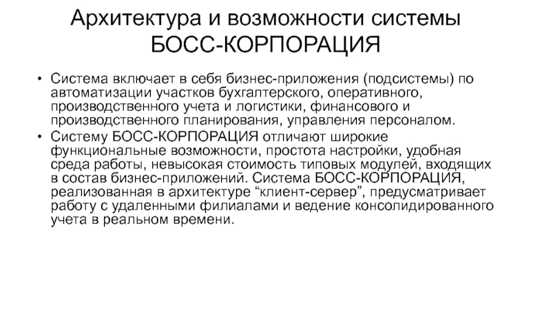 Слайд 6Архитектура и возможности системы БОСС-КОРПОРАЦИЯ