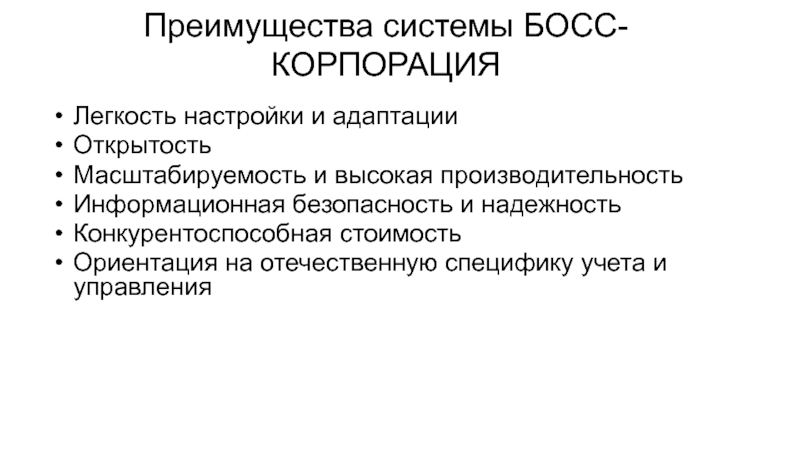 Слайд 13Преимущества системы БОСС-КОРПОРАЦИЯ