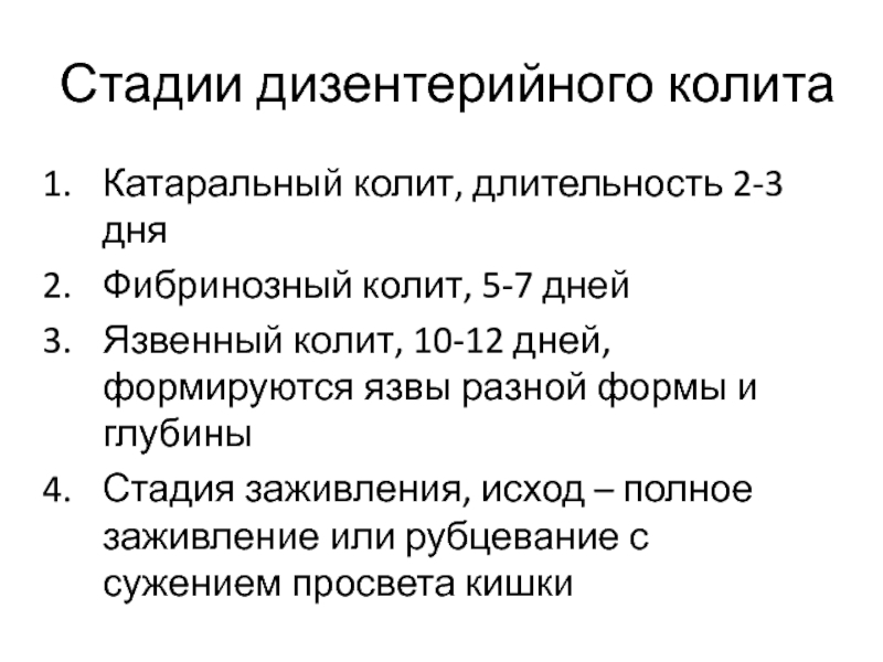 колит, 10-12 дней, формируются язвы разной формы и глубины