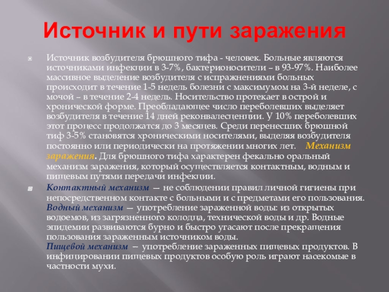 массивное выделение возбудителя с испражнениями больных происходит в течение 1-5 недель болезни с максимумом на 3-й неделе, с мочой – в течение 2-4 недель. Носительство протекает в острой и хронической форме. Преобладающее число переболевших выделяет возбудителя в течение 14 дней реконвалесценции. У 10% переболевших этот процесс продолжатся до 3 месяцев. Среди перенесших брюшной тиф 3-5% становятся хроническими носителями, выделяя возбудителя постоянно или периодически на протяжении многих лет. Механизм заражения. Для брюшного тифа характерен фекально оральный механизм заражения, который осуществляется контактным, водным и пищевым путями передачи инфекции.