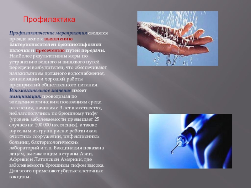 путей передачи возбудителей, что обеспечивают налаживанием должного водоснабжения, канализации и хорошей работы предприятий общественного питания. Вспомогательное значение имеет иммунизация, проводимая по эпидемиологическим показаниям среди населения, начиная с 3 лет в местностях, неблагополучных по брюшному тифу (уровень заболеваемости превышает 25 случаев на 100 000 населения), а также взрослым из групп риска: работникам очистных сооружений, инфекционных больниц, бактериологических лабораторий и т.п. Вакцинация показана лицам, выезжающим в страны Азии, Африки и Латинской Америки, где заболеваемость брюшным тифом высока. Для этого применяют убитые клеточные вакцины.