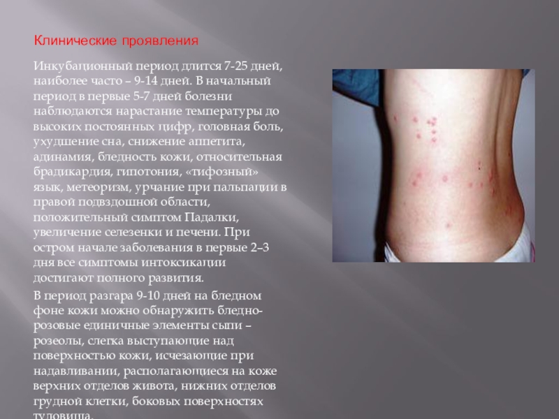 В период разгара 9-10 дней на бледном фоне кожи можно обнаружить бледно-розовые единичные элементы сыпи – розеолы, слегка выступающие над поверхностью кожи, исчезающие при надавливании, располагающиеся на коже верхних отделов живота, нижних отделов грудной клетки, боковых поверхностях туловища.