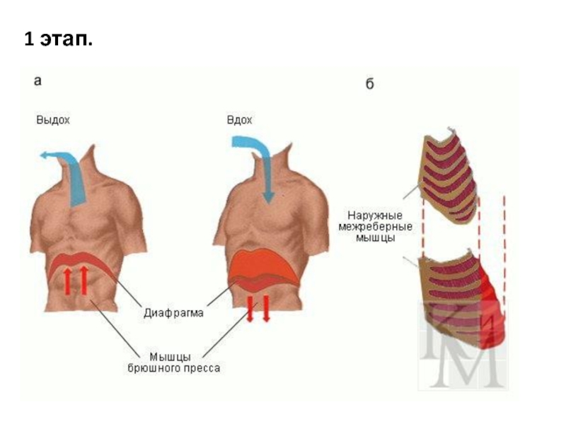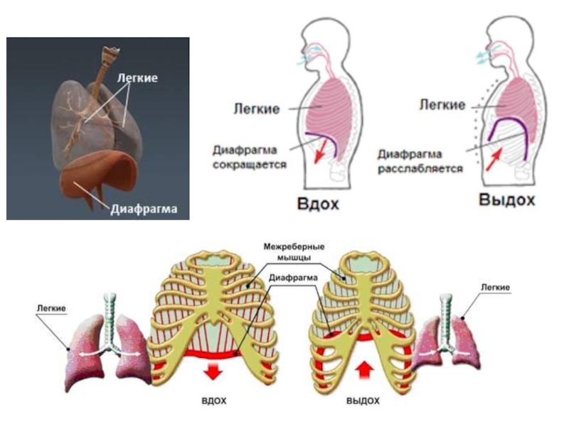 выдох осуществляются с помощью мышц: диафрагмы, межрёберных мышц.